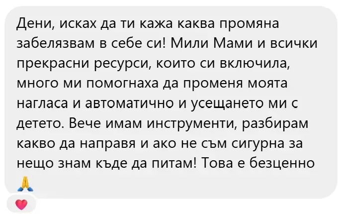 В Мили Мами аз, Деница, съм твоя ментор. Ще получаваш лични насоки, отговори на конкретни въпроси и ясни стъпки как да приложиш позитивното възпитание в ежедневието.