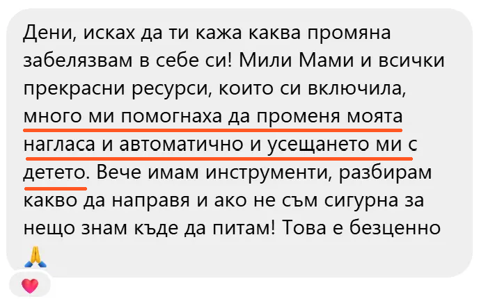 Затова в Мили Мами няма натиск, няма очаквания за перфектно справяне и няма универсални решения. Има процес, в който не си сама — и в който аз съм до теб, докато намираш своя начин.