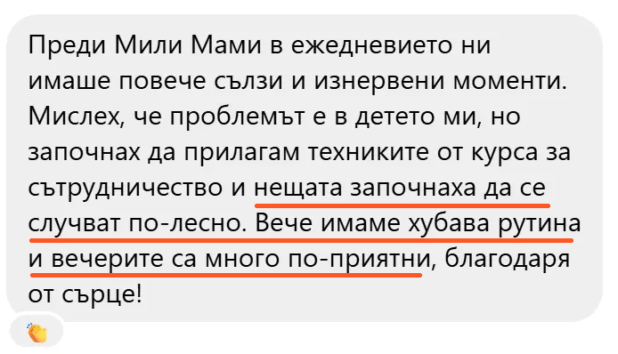 Сутрините текат с по-малко напрежение, а вечерите — с повече близост. Сцените около „не искам на градина“ и „няма да си лягам“ постепенно губят силата си, защото вече имаш ясен подход как да ги посрещаш.